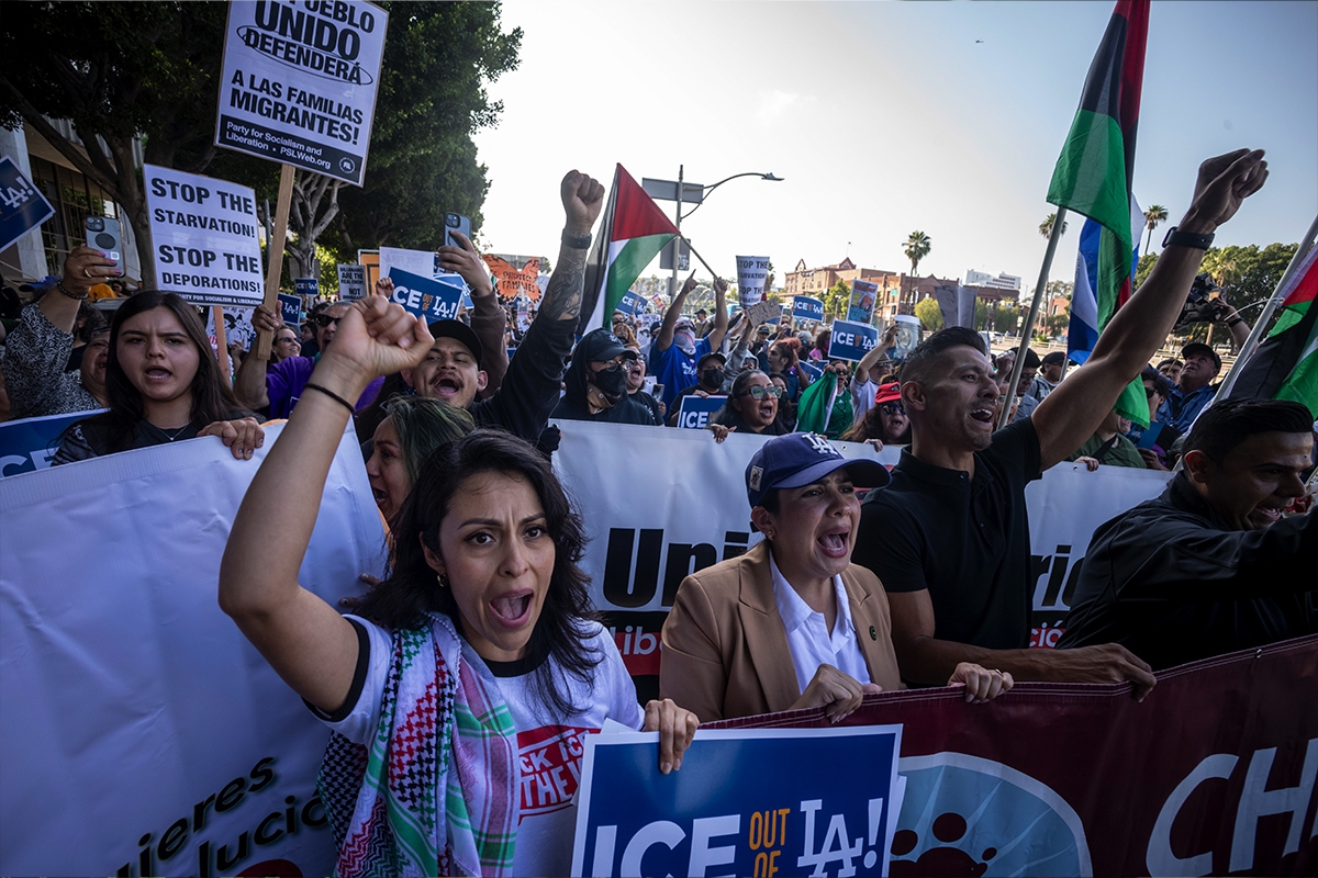 بعد اعتقال السلطات الاتحادية للهجرة أكثر من 40 شخصاً في أنحاء لوس أنجلس، تجمع محتجون أمام مركز احتجاز اتحادي مطالبين بالإفراج عنهم، قبل أن تتدخل الشرطة بعتاد مكافحة الشغب وتطلق قنابل الغاز المسيل للدموع لتفريق الحشد.