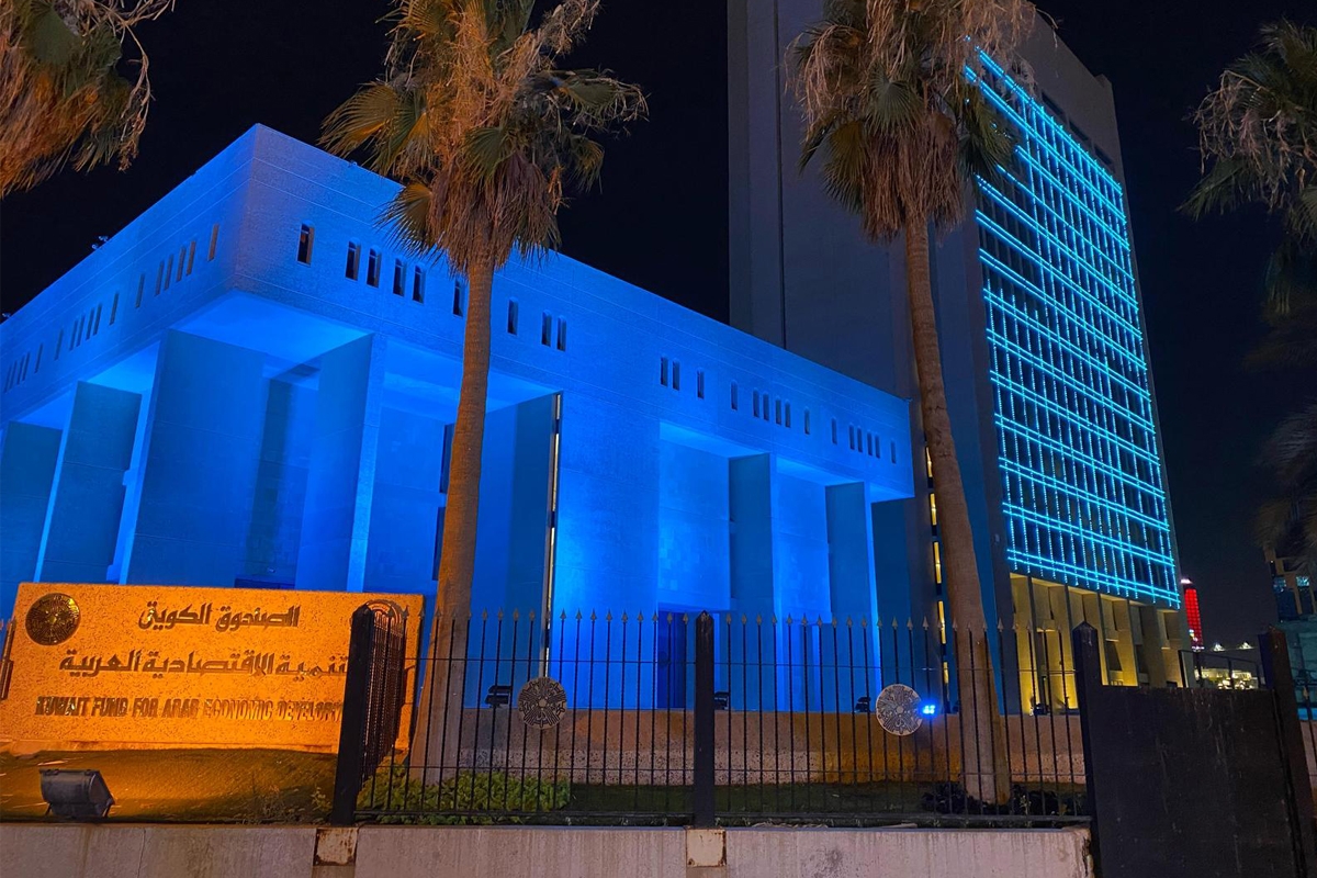 الصندوق الكويتي يضيء مبناه باللون الأزرق تضامناً مع اللاجئين