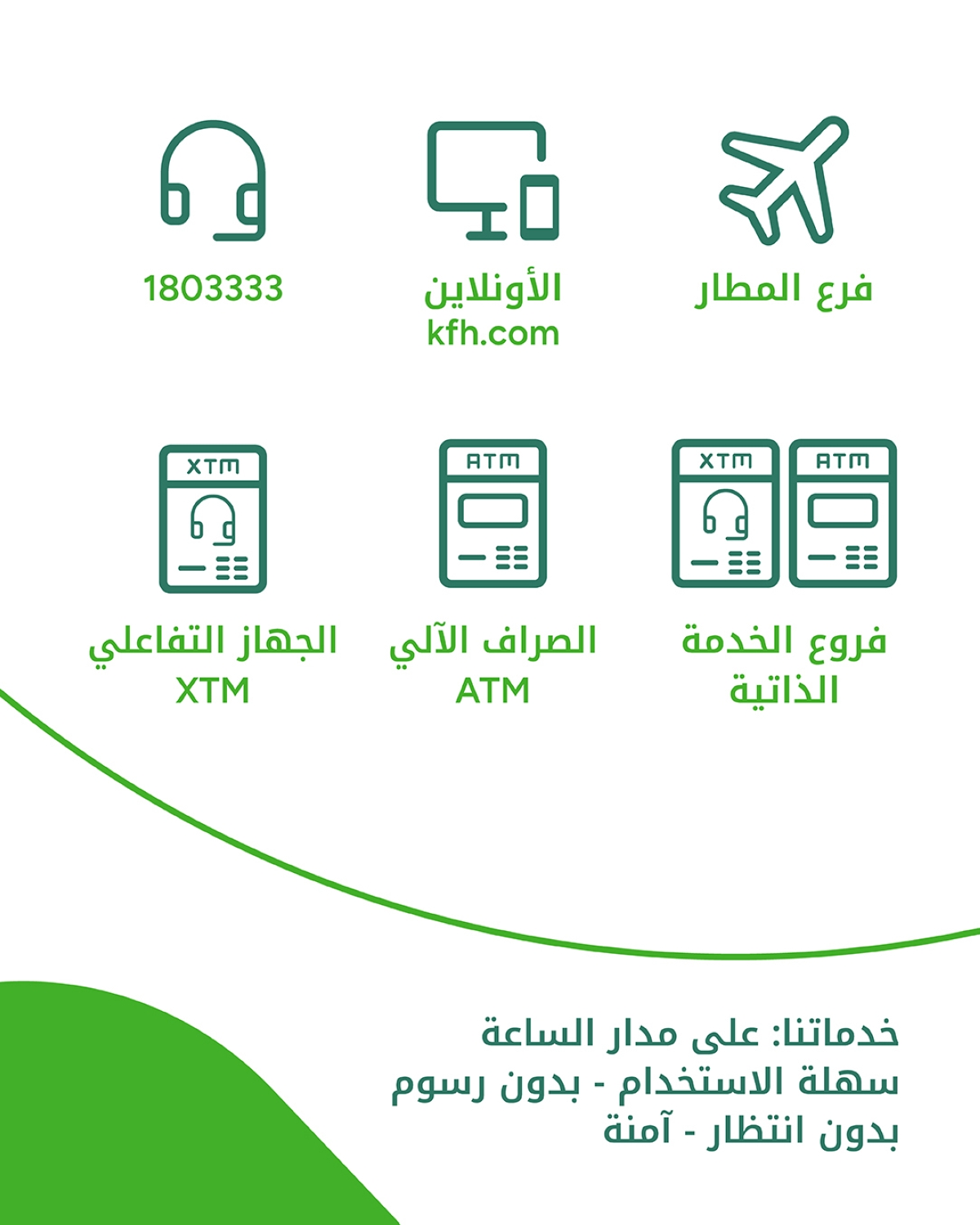 ويواصل مركز الاتصال تقديم الخدمات على مدار الساعة لتلقي اتصالات العملاء، والاستماع لمطالبهم والتجاوب معها، من خلال طاقم عمل مؤهل وتقنية متطورة. كما تعمل الخدمة الهاتفية الآلية (1803333) بذات الكفاءة والسرعة للتجاوب مع عمليات التحويل بين الحسابات والاستفسار عن العمليات المالية وغيرها.