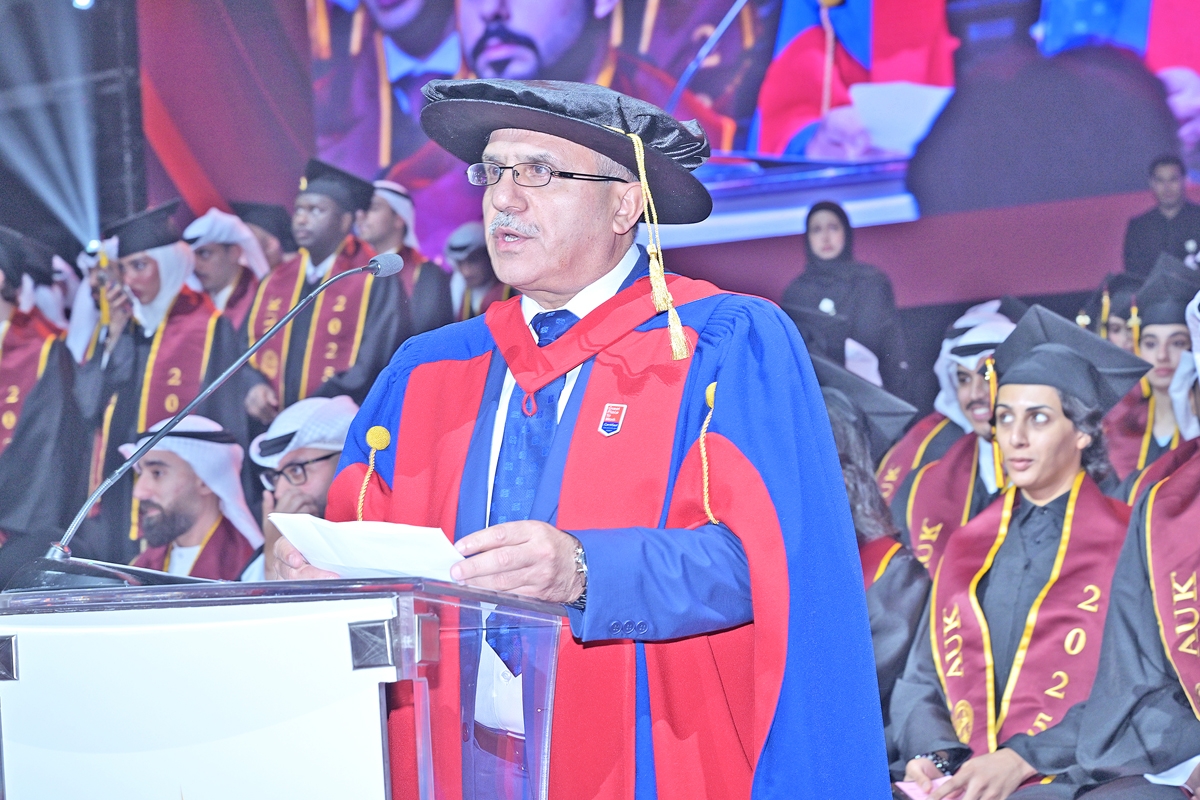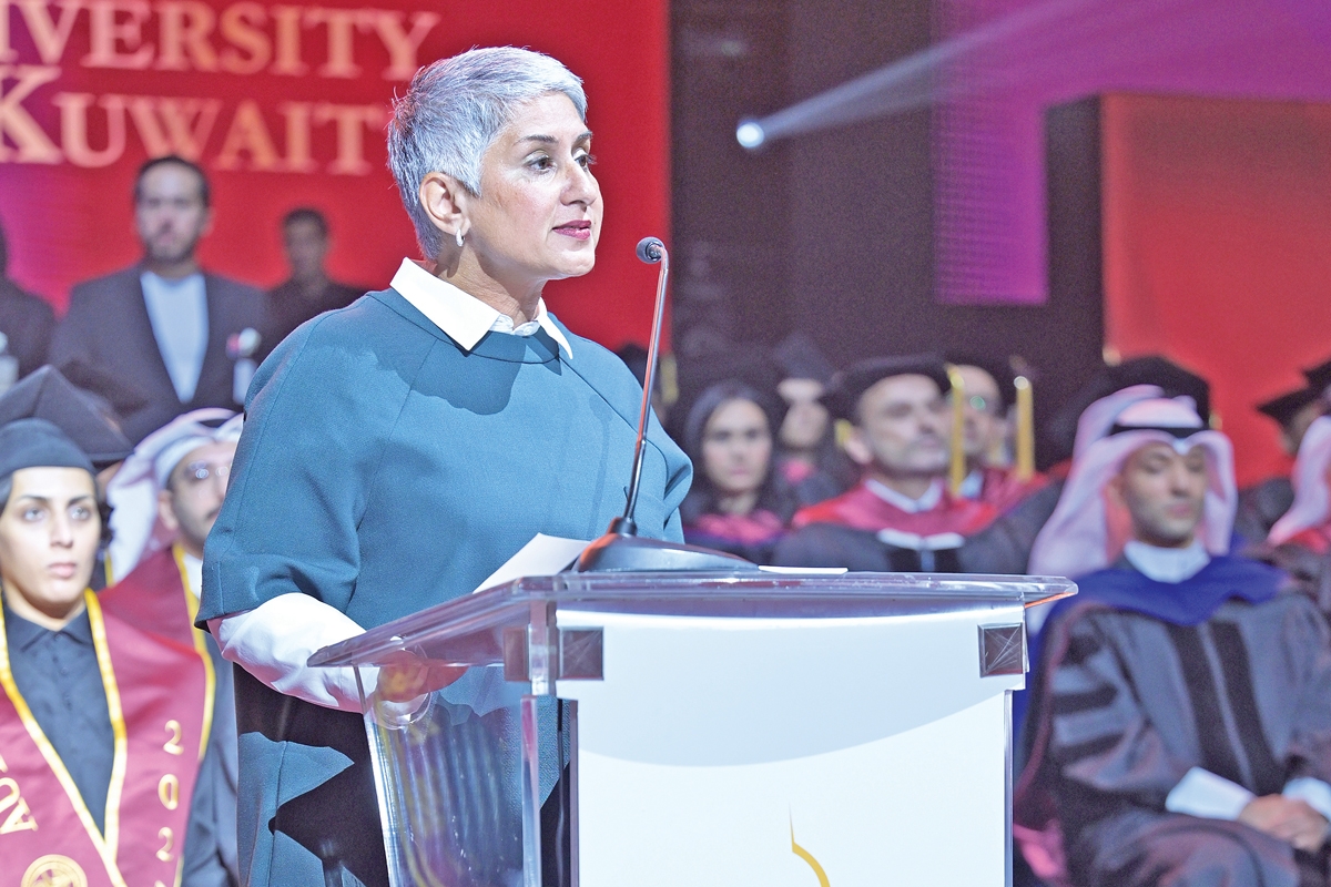 وافتتح الحفل بالنشيد الوطني وتلاوة عطرة من القرآن الكريم، ثم ألقت رئيسة الجامعة الأستاذة الدكتورة روضة عواد كلمة للطلبة الخريجين، حيث أشارت إلى التآزر الفريد بين التراث الثقافي للأمة والرؤية الأكاديمية للجامعة. وفي تسليطها الضوء على القيم الراسخة التي تُشكّل كلاً من الكويت والجامعة، صرّحت قائلة: «إن التزام الكويت الطويل بالتعليم، وروحها الدائمة في الكرم، وقيمها المدنية العميقة، توفر أساساً ثقافياً ينسجم بشكل عميق مع مبادئ التعليم الليبرالي. وهذا التلاقي المتناغم بين الرؤية العالمية والتقاليد المحلية هو ما يمنح الجامعة الأمريكية في الكويت طابعها المميز وأهميتها المستمرة».