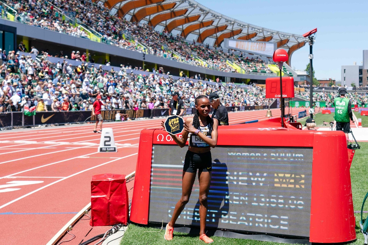 حطَّمت البطلة الأولمبية الكينية بياتريس تشيبيت، الرقم القياسي العالمي لسباق 5 آلاف متر، بتسجيلها 13:58.06 دقيقة، السبت، في لقاء يوجين لألعاب القوى، ضمن الدوري الماسي في أوريغون الأميركية، فيما عززت مواطنتها فيث كيبييغون رقمها القياسي في 1500م.