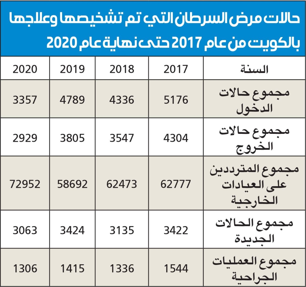 وبموجب تلك الأرقام، فقد بلغت حالات مرضى السرطان التي تم تشخيصها وعلاجها في الكويت خلال الفترة بين عامي 2017 و2020 نحو 17658 حالة دخول المستشفيات، في حين بلغ مجوع المترددين على العيادات الخارجية خلال الفترة ذاتها 256894 مراجعة، وأجريت 5601 عملية جراحية خلالها.