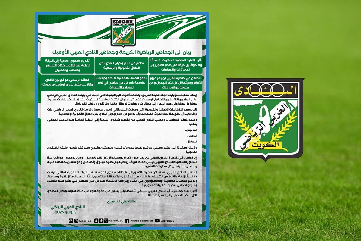 وفي ختام البيان، أكد النادي لجماهيره الوفية أن العربي سيظل متمسكاً بحقوقه ومبادئه، وسيواصل الدفاع عن كيانه بكل الوسائل القانونية المتاحة.