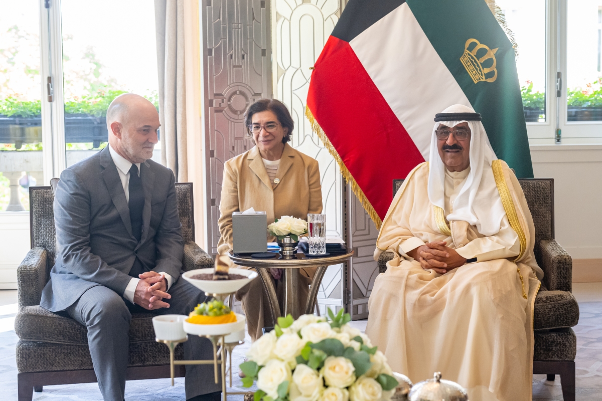 استقبل سمو أمير البلاد الشيخ مشعل الأحمد عصر اليوم الرئيس التنفيذي لمستشفى غوستاف روسيه البروفيسور فابريس بارليسي والمستشار الدولي للرئيس التنفيذي ريمي تيوليت وذلك في مقر إقامة سموه بالعاصمة الفرنسية باريس.