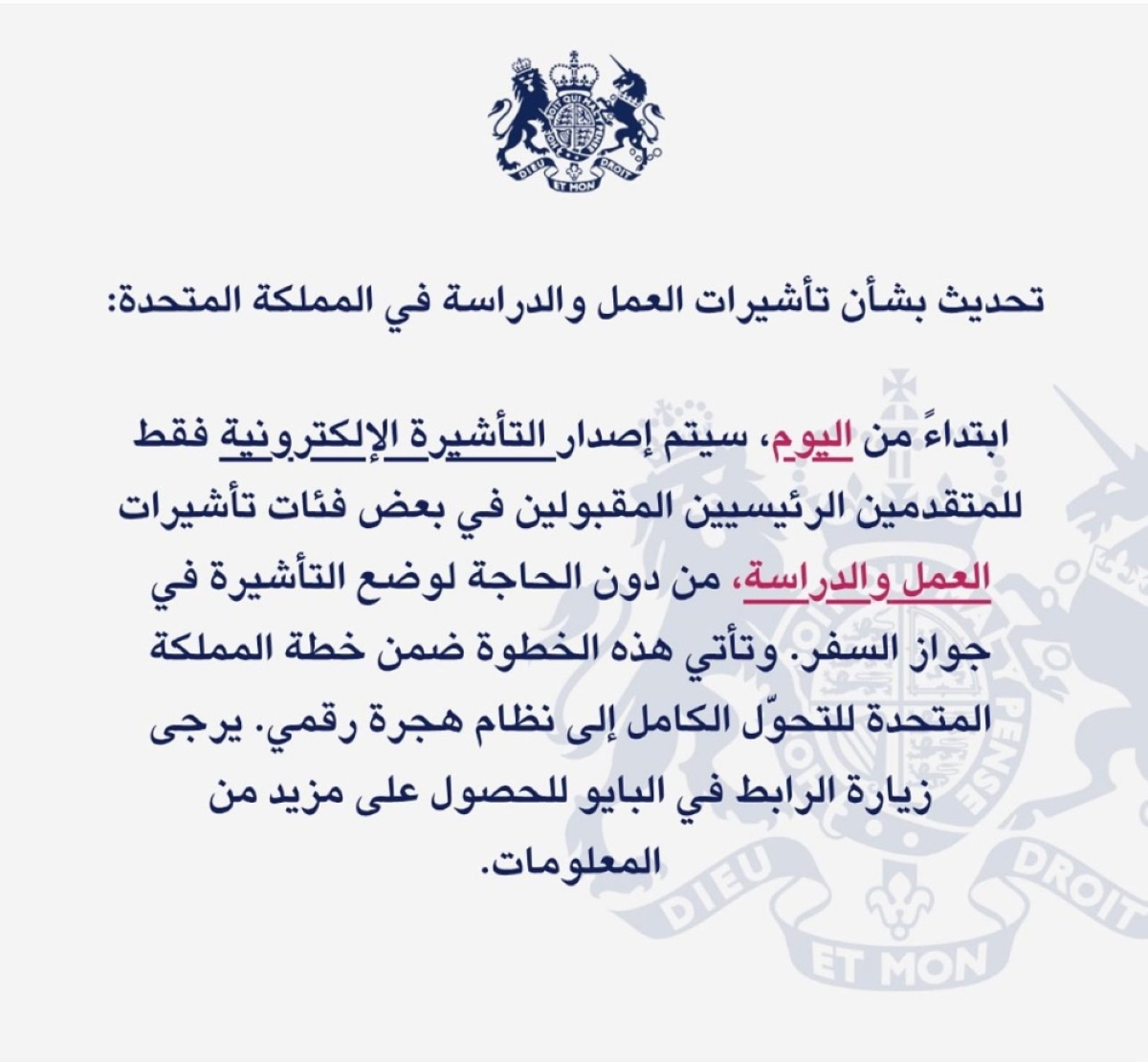 وأكدت السفارة، في بيان على موقعها الإلكتروني اليوم، أن «هذه الخطوة تأتي ضمن خطة المملكة المتحدة للتحول الكامل إلى نظام هجرة رقمي».