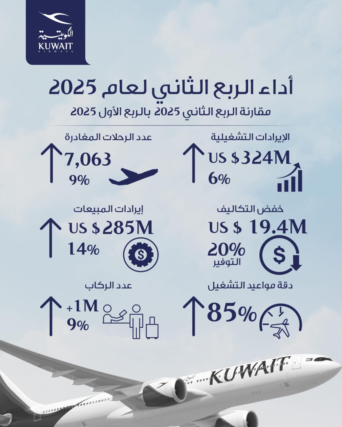 أعلنت شركة الخطوط الجوية الكويتية، تحقيق نتائج إيجابية في الربع الثاني من 2025 مقارنة بالربع الأول من نفس العام، حيث يواصل الناقل الوطني للكويت جهوده الدؤوبة للوصول إلى إنجازات وتطور في منظومة التشغيل بالكامل، تماشياً مع الخطة التشغيلية للشركة للعام الحالي.