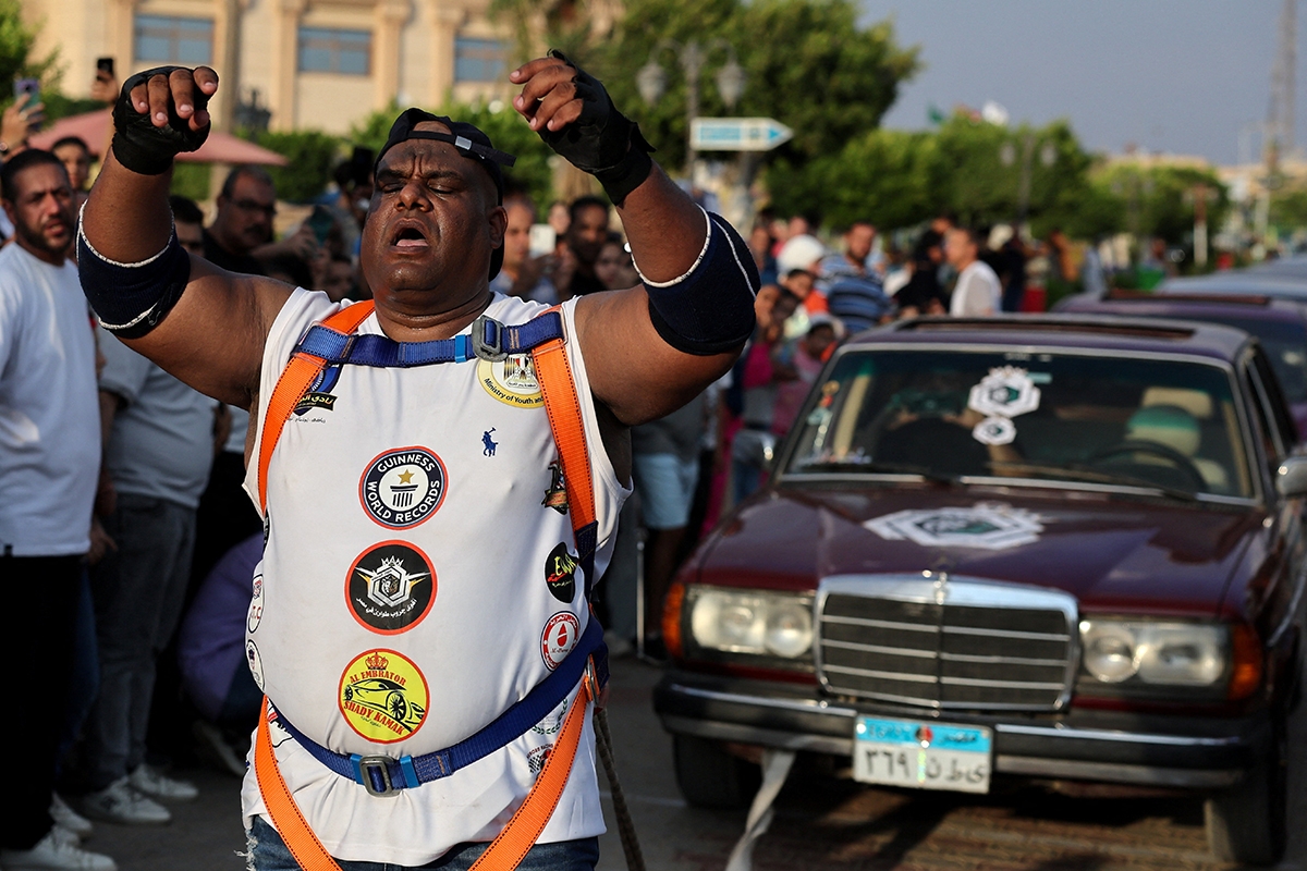 جرّ المصارع المصري أشرف محروس، المعروف بأشرف كابونجا، 20 سيارة لمسافة 10 أمتار يوم الجمعة في محاولة لتسجيل رقم قياسي عالمي في موسوعة جينيس.