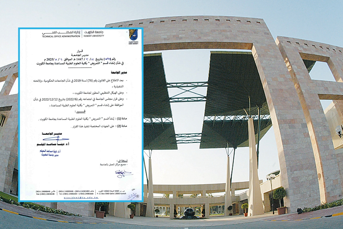 أصدرت مديرة جامعة الكويت د. دينا الميلم قراراً بإنشاء قسم التمريض بكلية العلوم الطبية المساعدة، بناءً على قرار مجلس الجامعة في اجتماعه رقم 2022/6 بتاريخ 12/12/2022 بشأن الموافقة على إنشاء قسم التمريض بكلية العلوم الطبية المساعدة.