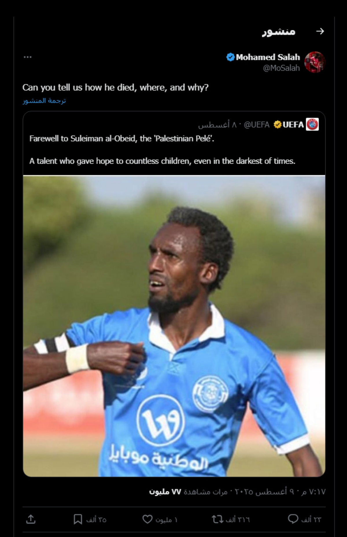 انتقد لاعب ليفربول الإنكليزي النجم المصري محمد صلاح الاتحاد الأوروبي لكرة القدم (ويفا) في نعيه للاعب منتخب فلسطين السابق سليمان العبيد الملقب بـ«بيليه فسلطين»، لأنه لم يذكر كيف قُتِل الأخير برصاص الجيش الاسرائيلي في قطاع غزة.