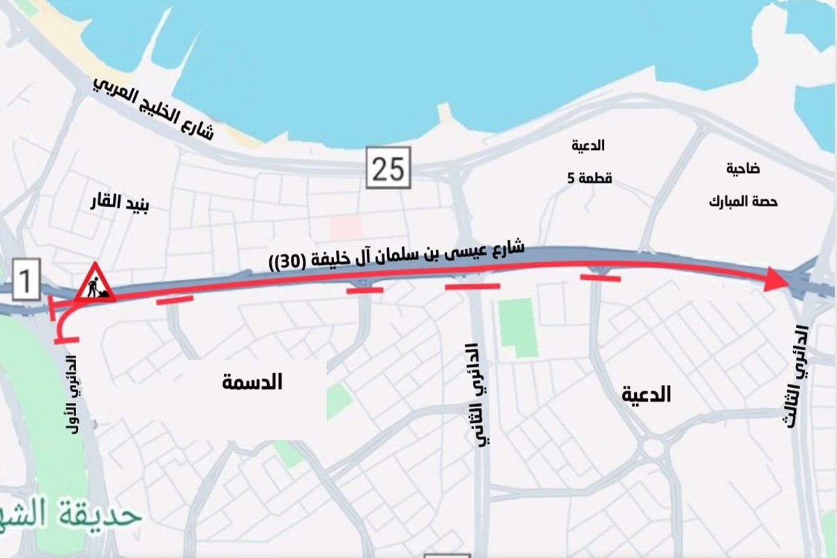 أعلنت الإدارة العامة للمرور، إغلاق شارع عيسى بن سلمان آل خليفة «الفحيحيل 30» بداية من تقاطع الدائري الأول وحتى تقاطع الدائري الثالث باتجاه الجنوب المؤدي إلى الفحيحيل، وكذلك إغلاق المداخل والمخارج على طريق «الفحيحيل 30» بمنطقتي الدسمة والدعية والدائري الثاني اعتباراً