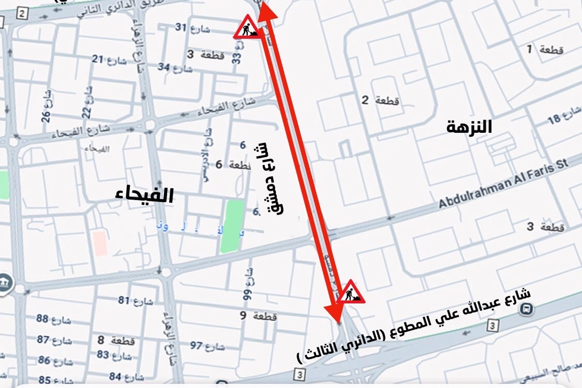 أعلنت الإدارة العامة للمرور، أمس، إغلاق الحارتين السريعة والوسطى على شارع دمشق بالاتجاهين، بدايةً من تقاطع طريق الدائري الثاني إلى تقاطع «الثالث»، اعتباراً من اليوم، ولمدة شهر، لأعمال الصيانة.