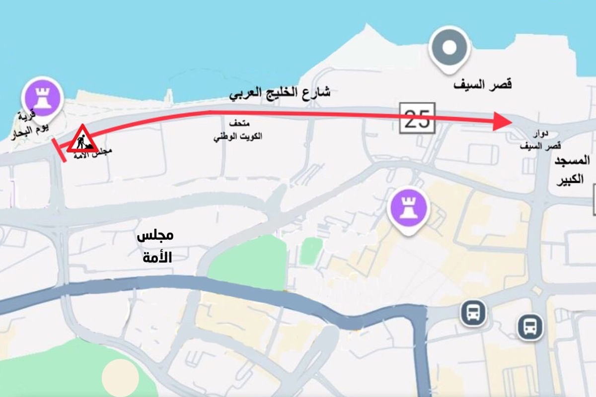 كما أعلنت عن إغلاق كامل لشارع الخليج العربي ابتداءً من تقاطع مجلس الأمة باتجاه دوار قصر السيف، وذلك من الساعة الرابعة عصر يوم غد الخميس الموافق 21 أغسطس 2025 وحتى الساعة السادسة من صباح يوم الأحد الموافق 24 أغسطس 2025.