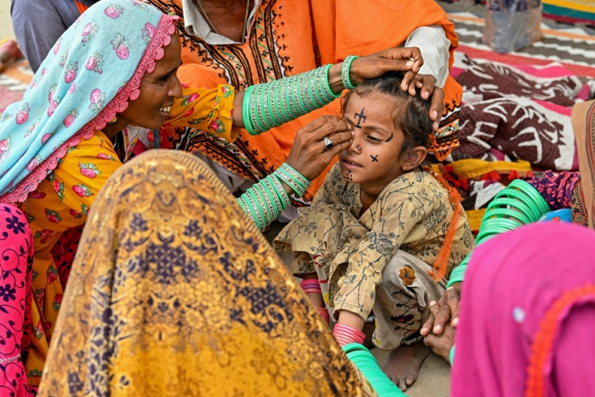 بعد خلط كمية من الفحم مع بضع قطرات من حليب الماعز، تستدير باسران جوغي (60 عاماً) حاملة إبرتها نحو ضيفتيها، وهما طفلتان باكستانيتان جاءتا للحصول على أول وشم تقليدي لهما.