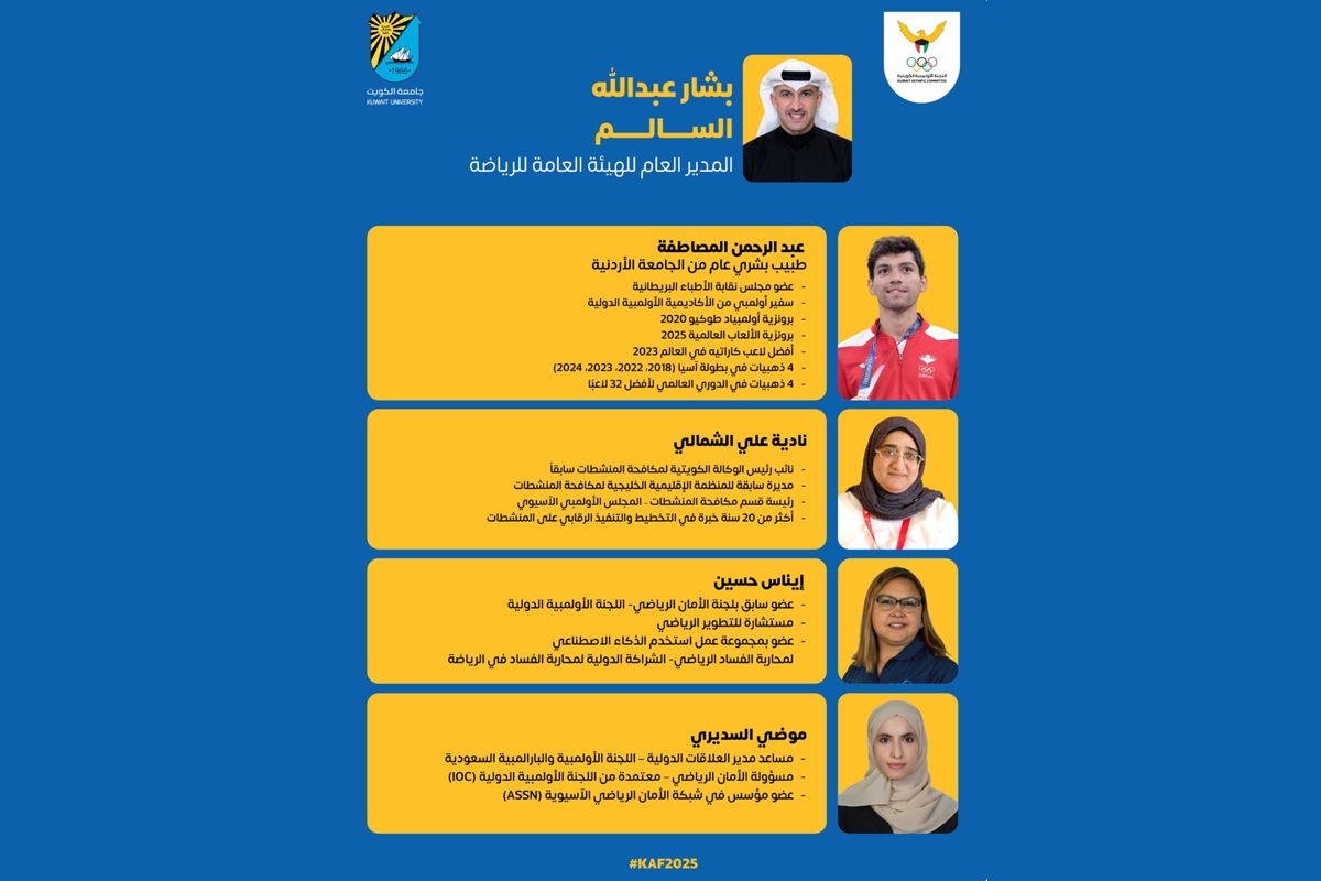 ينطلق اليوم منتدى الرياضيين الكويتي 2025 في مركز المؤتمرات بمدينة صباح السالم الجامعية بجامعة الكويت، وذلك برعاية رئيس اللجنة الأولمبية الكويتية الشيخ فهد الناصر، وبالتعاون مع برنامج التضامن الأولمبي والمجلس الأولمبي الآسيوي.