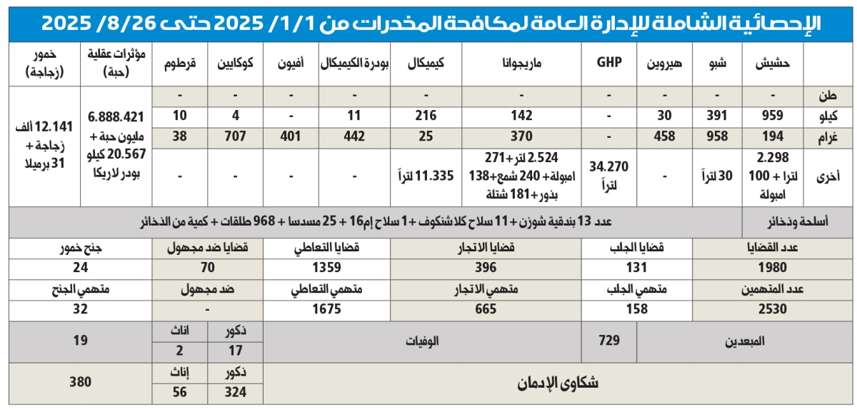 وأوضح أن الأجهزة الأمنية تضبط يومياً تجار مخدرات، «لكننا لا نعلن إلا عن القضايا ذات الكميات الكبيرة»، لافتاً إلى أن مواجهة هذه الآفة لا تقف عند حدود الضبطيات، بل تتطلب تضافر الجهود، وتستدعي معالجات موازية عبر انشاء مصحات علاجية، «وهو ما نعمل عليه الآن».