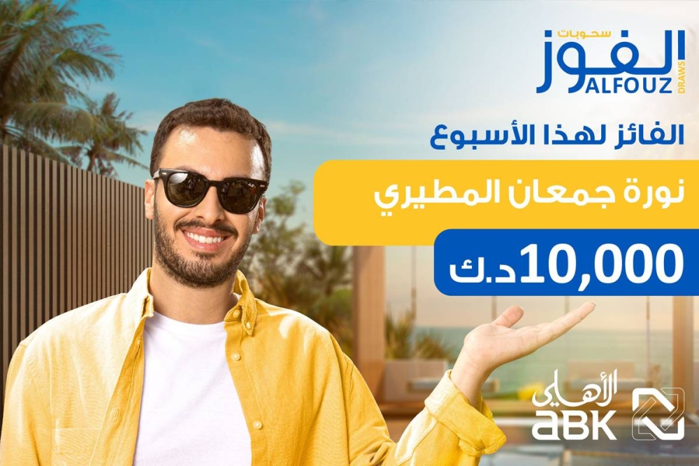 أعلن البنك الأهلي الكويتي، أمس، فوز نورة جمعان المطيري في السحب الأسبوعي لحساب «الفوز» للجوائز، بجائزة نقدية قدرها 10.000 دينار، الذي أقيم تحت إشراف وزارة التجارة والصناعة.