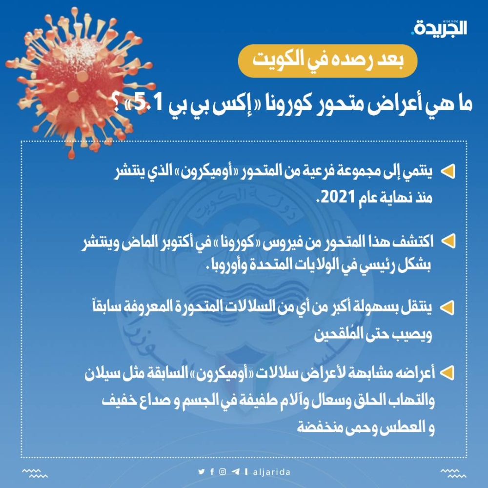 أكدت وزارة الصحة أنه في إطار متابعة الوضع الوبائي، وجهود الفريق الاستشاري المعني بتطورات فيروس «كورونا»، فقد أظهرت الفحوصات الجينية في الوزارة رصد متحور «XBB.1.5» الذي ينتمي إلى مجموعة فرعية من المتحور أوميكرون، من فيروس «كوفيد 19».