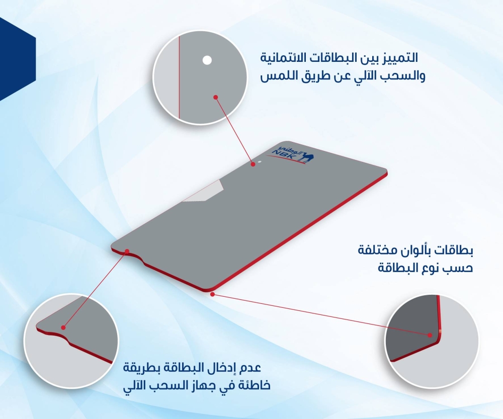 وفي إطار حرصه على أداء مسؤوليته الاجتماعية، أدخل «الوطني» العديد من الميزات الجديدة المصممة للعملاء من ضعاف البصر، حيث تتيح الميزات الجديدة تمييز البطاقة التي يرغبون في استخدامها حتى في الظلام، وهو ما يسمح للعملاء من ذوي الاحتياجات الخاصة بتمييز البطاقة عن طريق اللمس من خلال وجود ميزة خاصة بكل بطاقة.