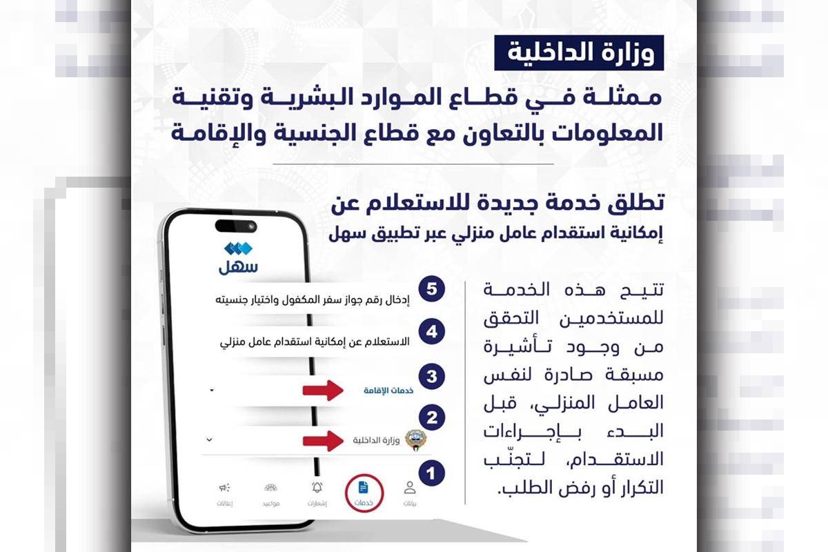 أطلقت وزارة الداخلية، ممثلة بقطاع الموارد البشرية وتقنية المعلومات، بالتعاون مع قطاع الجنسية والإقامة، خدمة جديدة للاستعلام عن إمكانية استقدام عامل منزلي عبر تطبيق سهل.