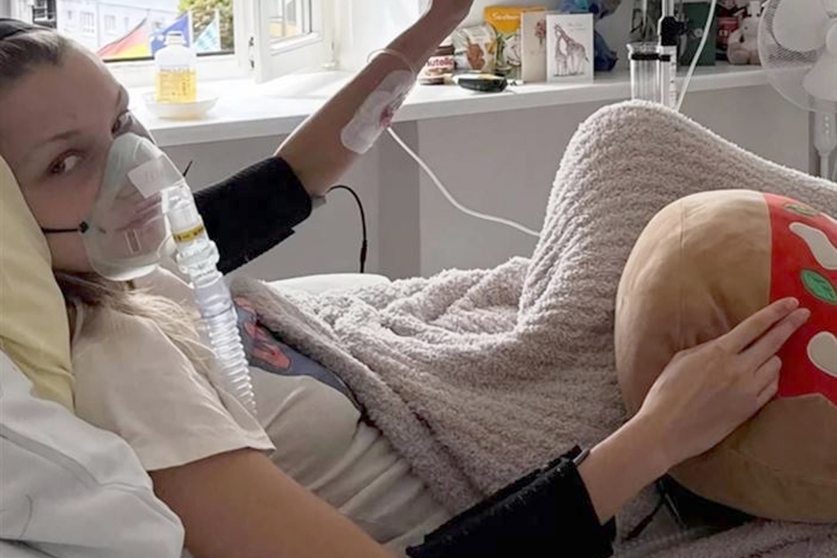وكانت إحدى الصور وهي جالسة على السرير، ويبدو عليها الإعياء والحزن، وأخرى يدها متصلة بمحاليل، وتضع جهاز الأوكسجين.