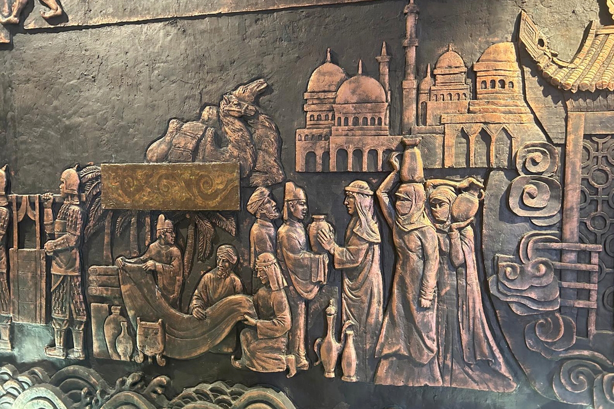 ويصوّر أحد النقوش في متحفه بحاراً صينياً يعرض قماشا حريرياً على تجار عرب، وهو مشهد رمزي يتناغم مع التفاعل الاقتصادي والحضاري المعاصر بين الصين والدول العربية.