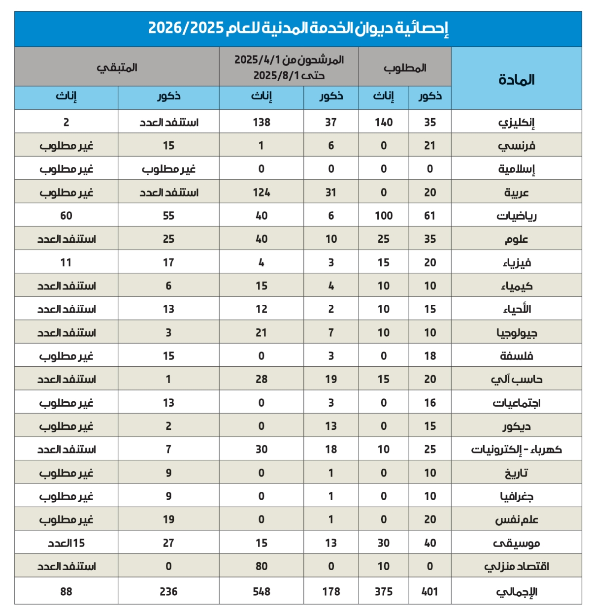 وبحسب الجدول الذي أرفقه ديوان الخدمة المدنية مع كتابه، فإن العدد المتبقي للتعاقد مع المعلمين يبلغ 324 بواقع 236 معلما و88 معلمة، لافتا إلى أن «التربية» استنفدت العدد في مادة اللغة الإنكليزية بالنسبة للذكور، فيما يتبقى 2 للاناث، و15 للذكور في اللغة الفرنسية، و55 للذكور في الرياضيات، و60 للاناث، و25 للذكور في مادة العلوم، و17 للذكور في مادة الفيزياء، و11 للإناث.