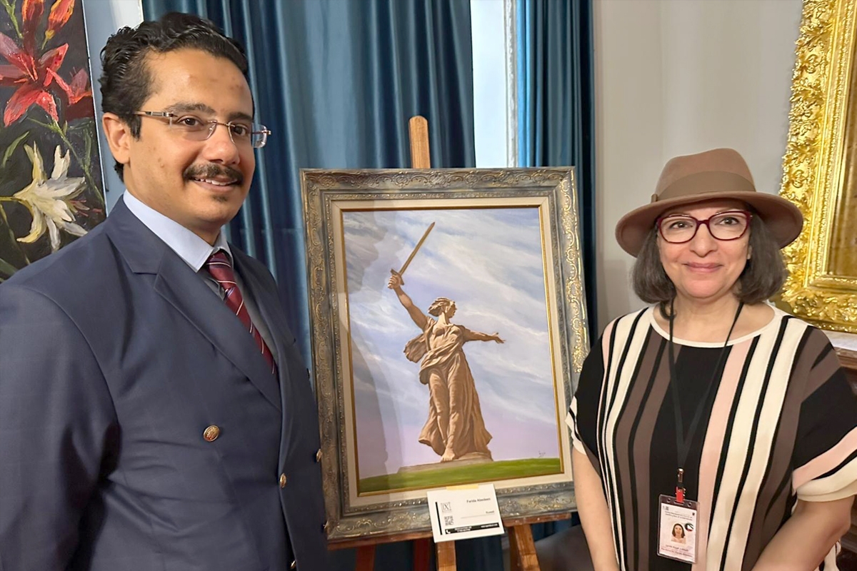 وعن عملها الذي شاركت به، قالت د. عابدين إنها قدَّمت لوحة زيتية جديدة بعنوان «ماذرلاند– الأرض الأم»، مُستوحاة من واحدة من أعظم المنحوتات التذكارية في العالم، والتي تجسِّد صمود روسيا في الحرب العالمية الثانية ضد النازية.