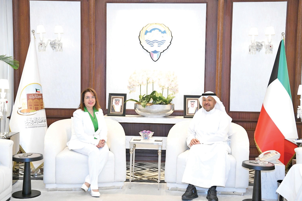 استقبل محافظ الفروانية الشيخ عذبي الناصر، في ديوان عام المحافظة، صباح اليوم، رئيسة بعثة الأمم المتحدة للمستوطنات البشرية «موئل» في الكويت ودول الخليج العربي د. أميرة الحسن.