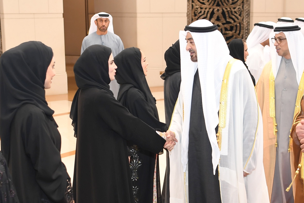 صاحب السمو والرئيس الإماراتي وولي العهد خلال استقبال المشاركين في الغداء التكريمي