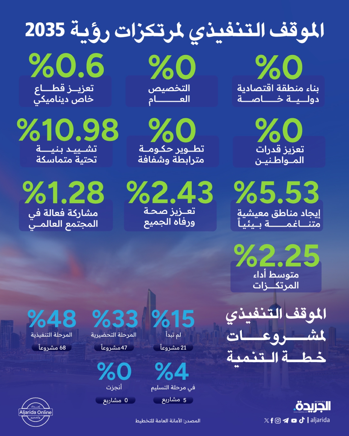 وحسب تقرير المتابعة، يشير الموقف التنفيذي لمشروعات الخطة السنوية بنهاية الربع الأول 2025/2026 إلى أن الخطة تتضمن 141 مشروعاً لم ينجز منها أي مشروع، وبلغ عدد المشاريع التي لم تبدأ 21 مشروعاً، وفي المرحلة التحضيرية 47 مشروعاً، وفي المرحلة التنفيذية 68 مشروعاً، وفي مرحلة التسليم 5 مشاريع، أما المرتكزات التسعة التي تقوم عليها خطة التنمية، بالتالي رؤية «الكويت 2035» فهي عند مستوى متدنّ جداً أي إن متوسط نسبة إنجازها - حسب التعبير الحكومي - 2.25 في المئة فقط.
