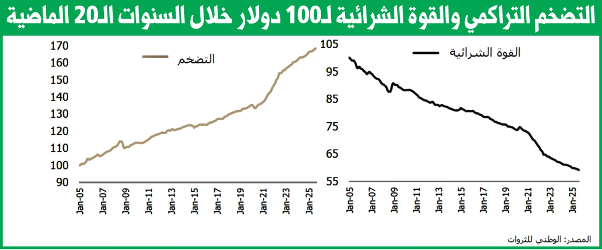المشكلة الجوهرية في الاحتفاظ بالنقد تكمن في التضخّم، فمع بلوغ متوسط معدّل التضخم في الولايات المتحدة نحو 2.5 في المئة سنويا خلال العقدين الماضيين، تراجعت القوة الشرائية للنقد بما يقارب 40 في المئة خلال تلك الفترة. المستثمرون الذين احتفظوا بالنقد أو بسندات قصيرة الأجل خلال هذه الفترة، حيث لم تتجاوز العوائد الحقيقية لتلك الأصول 1.7 في المئة في المتوسط، هم في الواقع واجهوا خسائر تدريجية غير محسوسة في ثرواتهم.