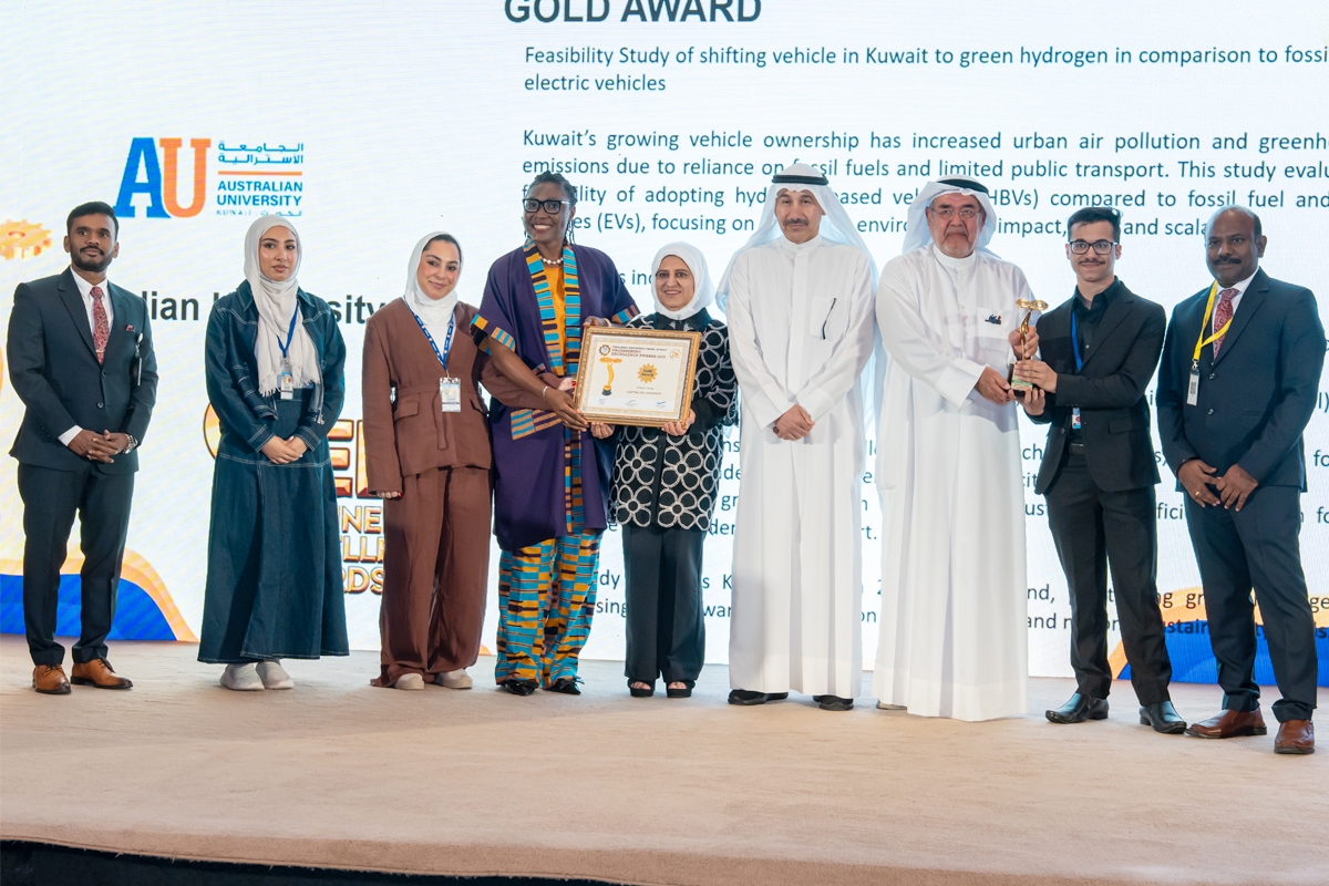 وجاء المشروع الحاصل على الجائزة الذهبية بعنوان «دراسة لجدوى تحويل المركبات في الكويت إلى الهيدروجين الأخضر مقارنة بالوقود الأحفوري والمركبات الكهربائية»، بإشراف الرضوان وبمشاركة الطلبة ياسمين العويشر، ومحمد عبدالمجيد، وفاطمة الخضري، ونوال السمحان.