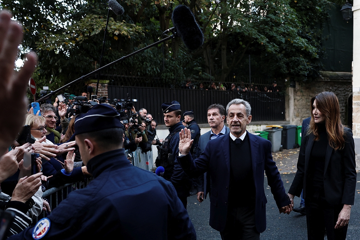 غادر ساركوزي منزله بباريس حوالي الساعة 9:10 صباحا بالتوقيت المحلي، ممسكا بيد زوجته كارلا بروني وبرفقة أبنائه وإخوته. وتجمع عشرات الأشخاص دعما لرئيس الدولة السابق، وصفقوا له عقب إنشاد النشيد الوطني الفرنسي.