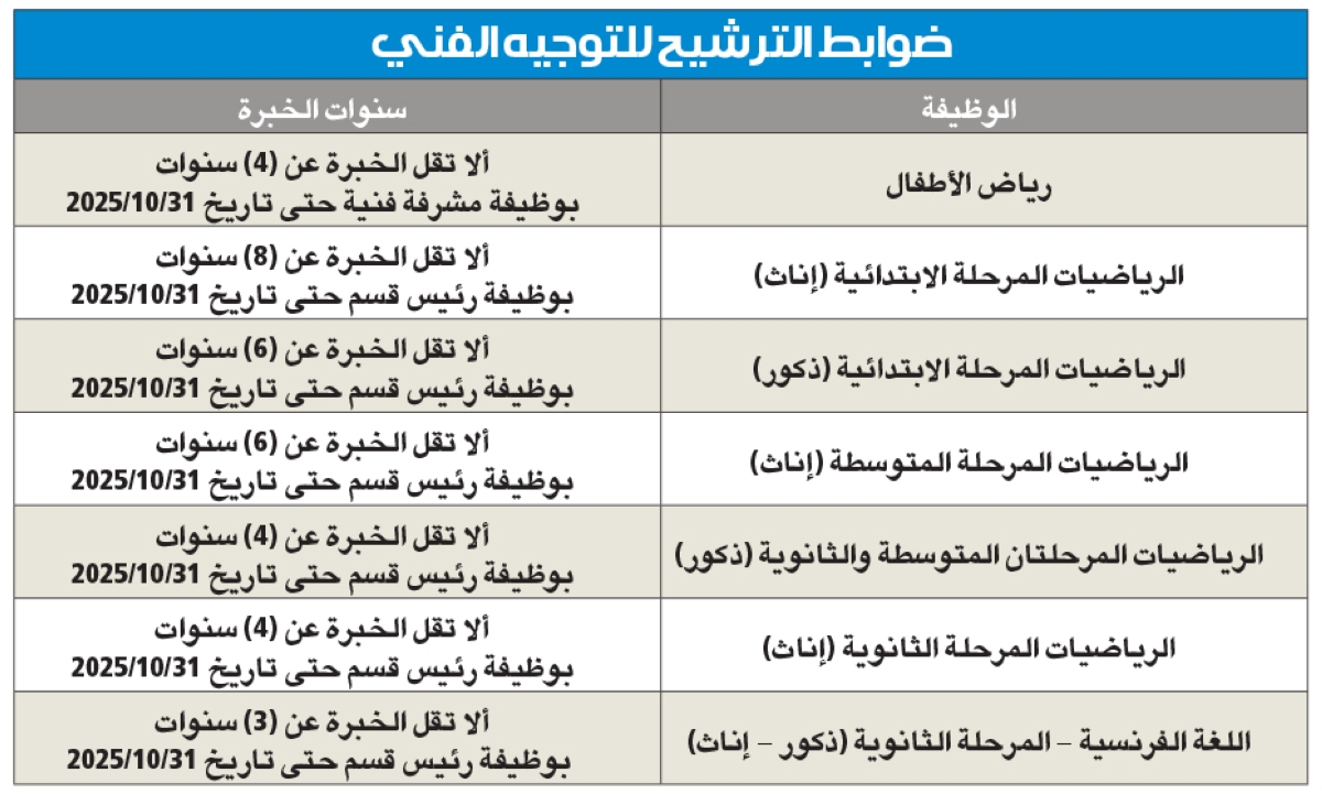 وذكرت أن شرط الترشح لوظيفة مدير مدرسة ثانوية (ذكور) هو 4 سنوات، ومدير مساعد 5 سنوات، فيما اشترطت 6 سنوات لوظيفة رئيس قسم لغة عربية وانكليزية وفرنسية ورياضيات، والعلوم بفروعها، والحاسب الآلي، والتربية الفنية والموسيقية.