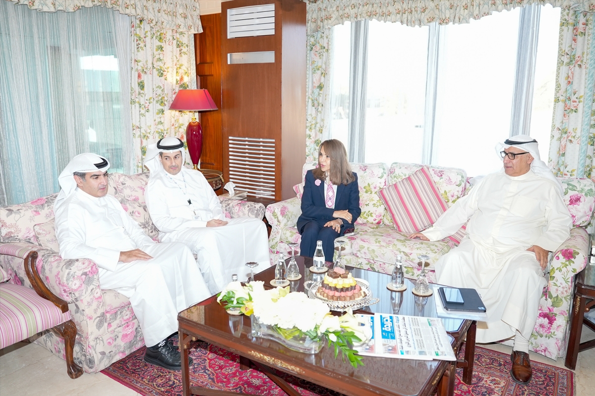 من اليمين عبدالعزيز البابطين وشيخة البحر ومحمد الصقر وصلاح الفليج ومشعل المنيخ وعادل الماجد
