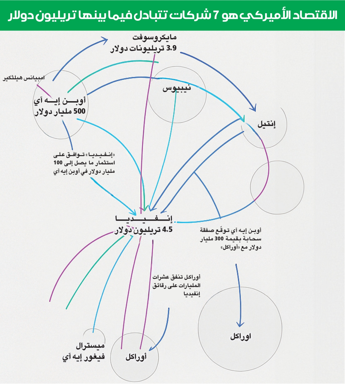 تقوم هذه الحلقة على معادلة بسيطة: مايكروسوفت تضخ مليارات الدولارات في «أوبن إيه آي»، والأخيرة تستخدم جزءاً كبيراً من هذه الأموال لشراء معالجات (GPUs) «إنفيديا» المتقدمة. هذه المشتريات ترفع إيرادات إنفيديا وقيمتها السوقية، الأمر الذي بدوره يرفع تقييمات شركات الذكاء الاصطناعي الأخرى. في الوقت نفسه، تسجل مايكروسوفت ارتفاعاً في الطلب على خدمات «أزور» السحابية، لأن نماذج «أوبن إيه آي» تعمل بالكامل على بنيتها التحتية. وهكذا تتكرر الدورة، بما يعطي انطباعاً بنمو استثنائي للقطاع، بينما الجزء الأكبر من الحركة المالية يدور داخل الدائرة نفسها لا عبر قاعدة واسعة من العملاء.