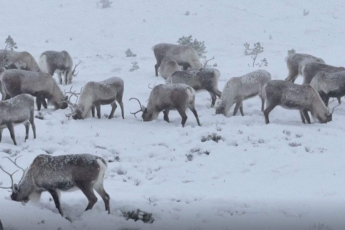 ترعى حيوانات الرنّة وسط الثلوج في المرتفعات الاسكتلندية، بينما تتوقف سيارات المارّة عبر سلسلة جبال كيرنغورمز لمشاهدة أفراد القطيع الوحيد الذي يتجول بحرية في المملكة المتحدة.