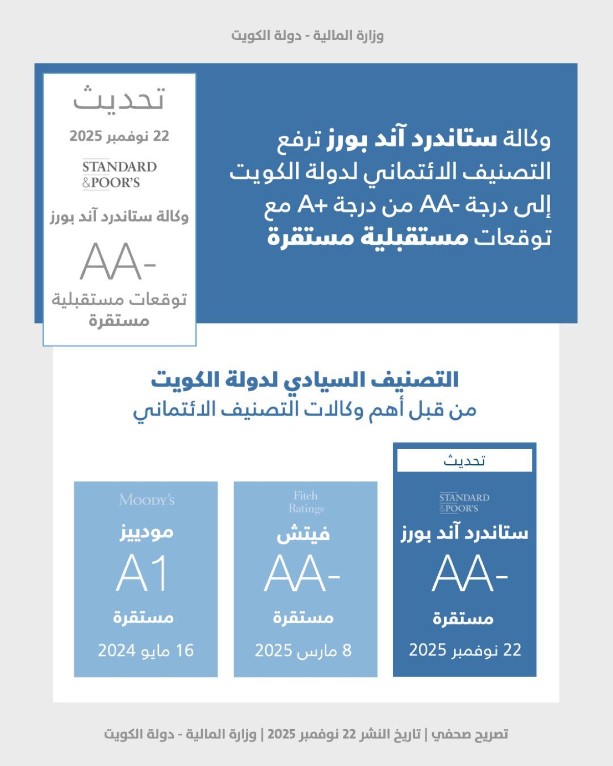 رفعت وكالة ستاندرد آند بورز العالمية (S&P) التصنيف السيادي للكويت من المرتبة «+A» إلى المرتبة «-AA» مع الإبقاء على نظرة مستقبلية مستقرة نتيجة التقدم في إصلاحات المالية العامة.