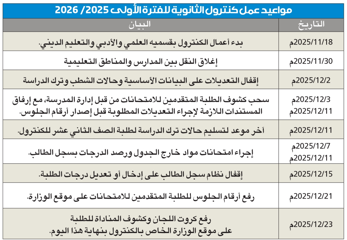 • وكيل التعليم أصدر قراراً حدد مواعيد وآلية عمل كنترول الثانوية