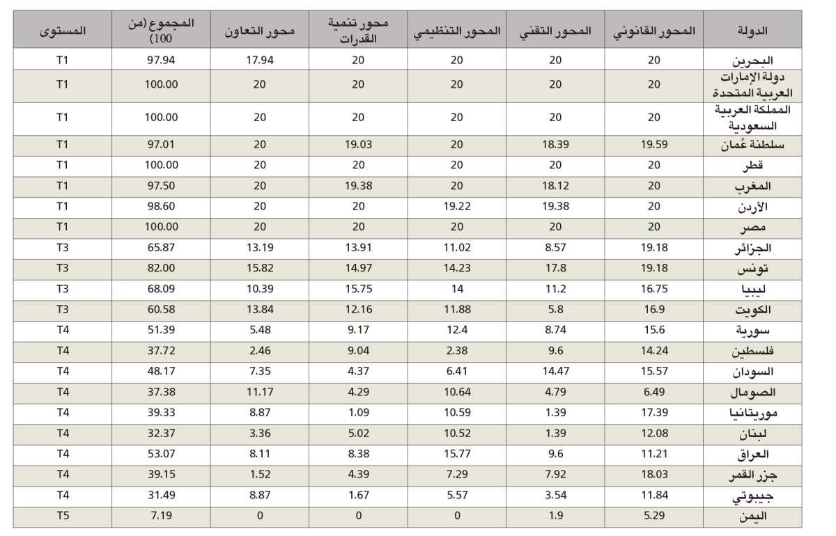 2. تفاوت النضج بين المحاور الخمسة، فعادةً ما تحقق الدول في T3 درجات معقولة في محور أو اثنين (غالباً القانوني والتنظيمي)، بينما تتراجع في المحاور الأكثر تعقيداً كتنمية القدرات والتعاون العملي الدولي والتقني المتقدم.