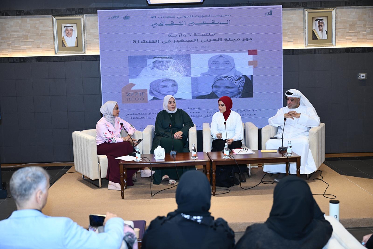 ثم جاءت الجلسة الحوارية «دور مجلة العربي الصغير في التنشئة»، التي أقيمت في المقهى الثقافي أيضا، بالتعاون مع مجلة العربي الصغير، وذلك في إطار الفعاليات المصاحبة للمعرض، وشارك فيها الكاتبة والناقدة د. هيا صالح آل ردن من الأردن، ومن الكويت الكاتب والناشر محمد شاكر جراغ، ومن مصر الروائية والقاصة، كاتبة أدب الأطفال، انتصار عبدالمنعم، وأدارت الحوار فيه محررة مجلة العربي الصغير، هذايل الحوقل.