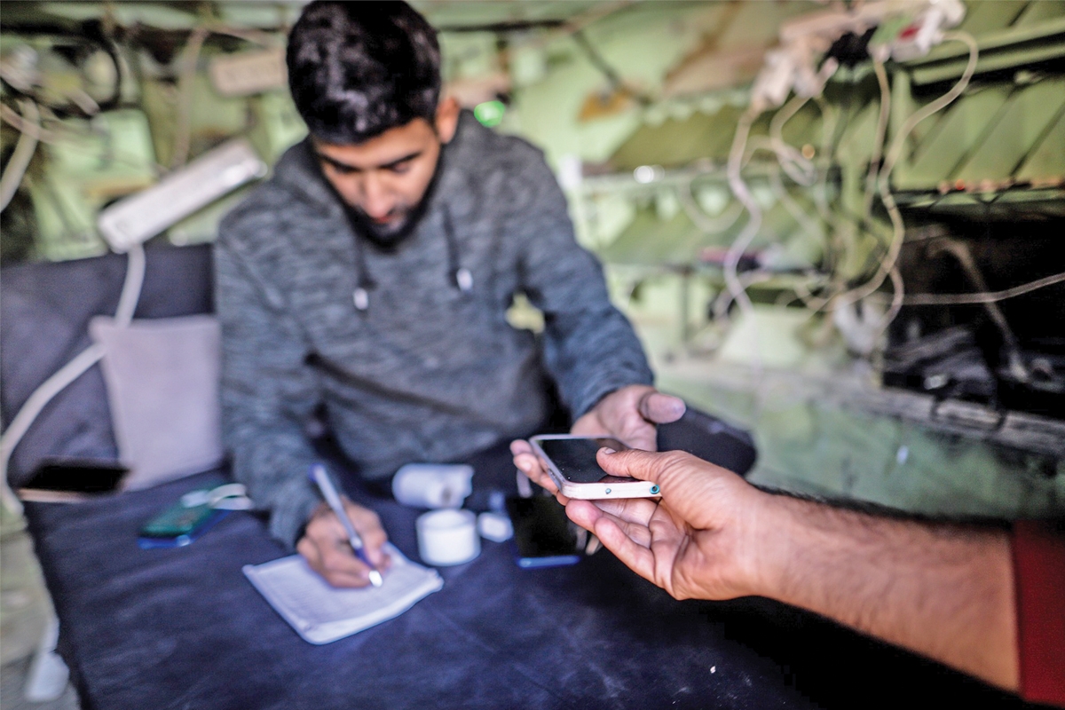 تستخدم دبابة تركتها إسرائيل محاطة بالحطام، بالقرب من مبنى تعرّض للقصف في حي تل الهوى بمدينة غزة منذ أسابيع، كنقطة شحن للهواتف الجوالة يتوجه إليها العديد من الفلسطينيين الذين لا يزالون يفتقدون الكهرباء.