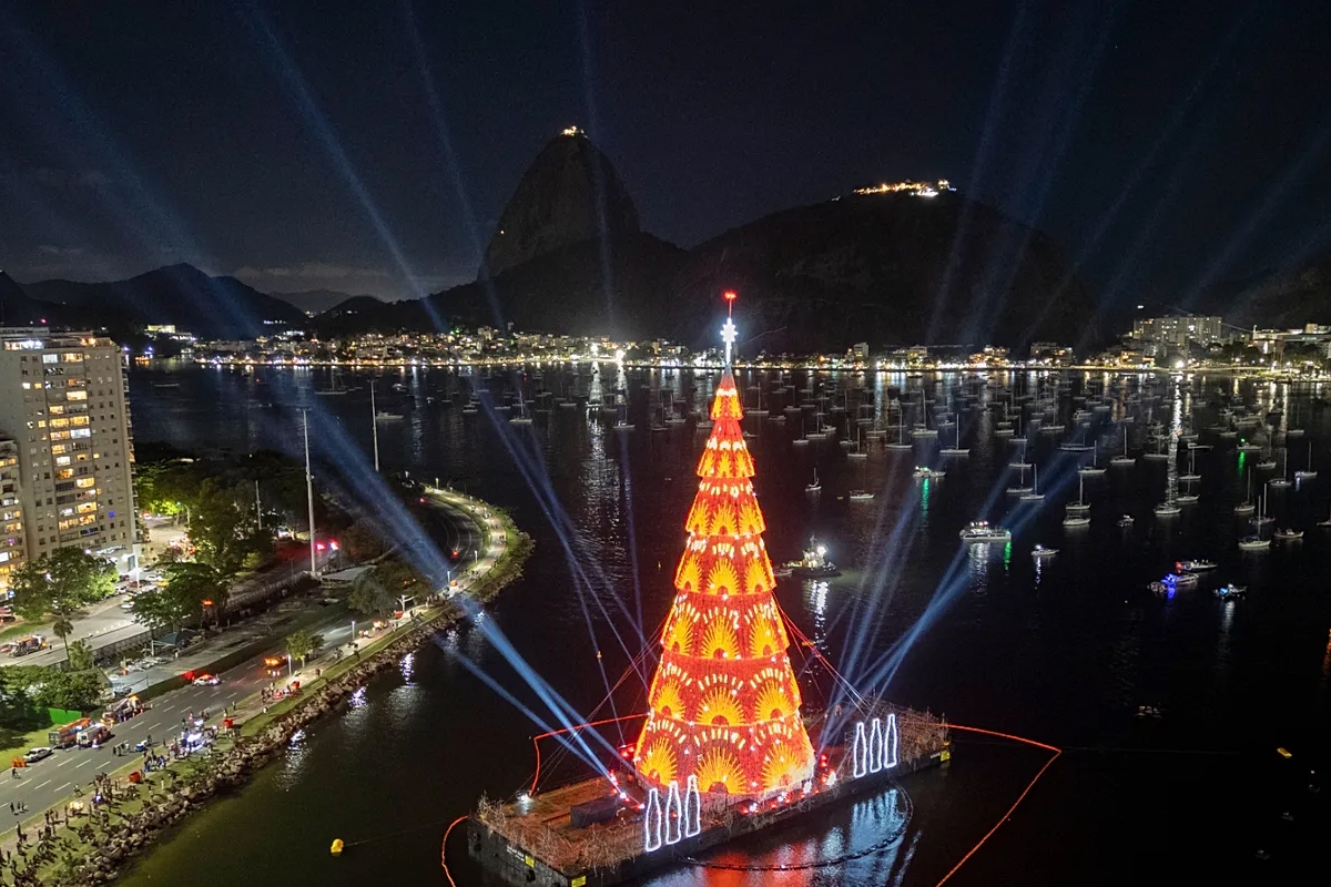 كشفت ريو دي جانيرو في البرازيل عن شجرة عيد ميلاد عائمة بارتفاع 80 مترا في خليج بوتافوغو، لتضيف معلما جديدا إلى موسم الأعياد في المدينة.