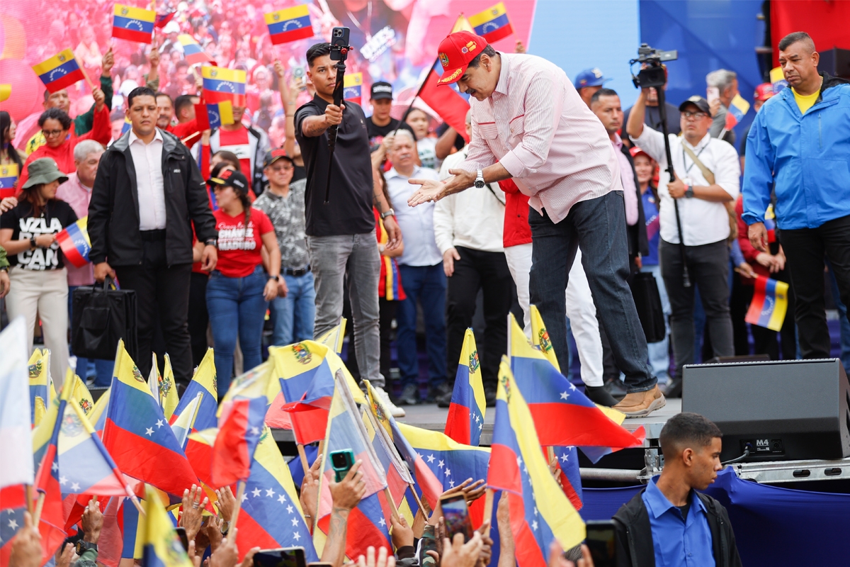 في تحد جديد للرئيس الأميركي دونالد ترامب، الذي جمع كبار مستشاريه لمناقشة خطوته التالية ضد فنزويلا، ظهرالرئيس الاشتراكي نيكولاس مادورو محاطاً بمسؤولين كباراً وهو يخاطب حشداً خارج القصر الرئاسي، ويقسم على «الولاء المطلق» للشعب الفنزويلي.