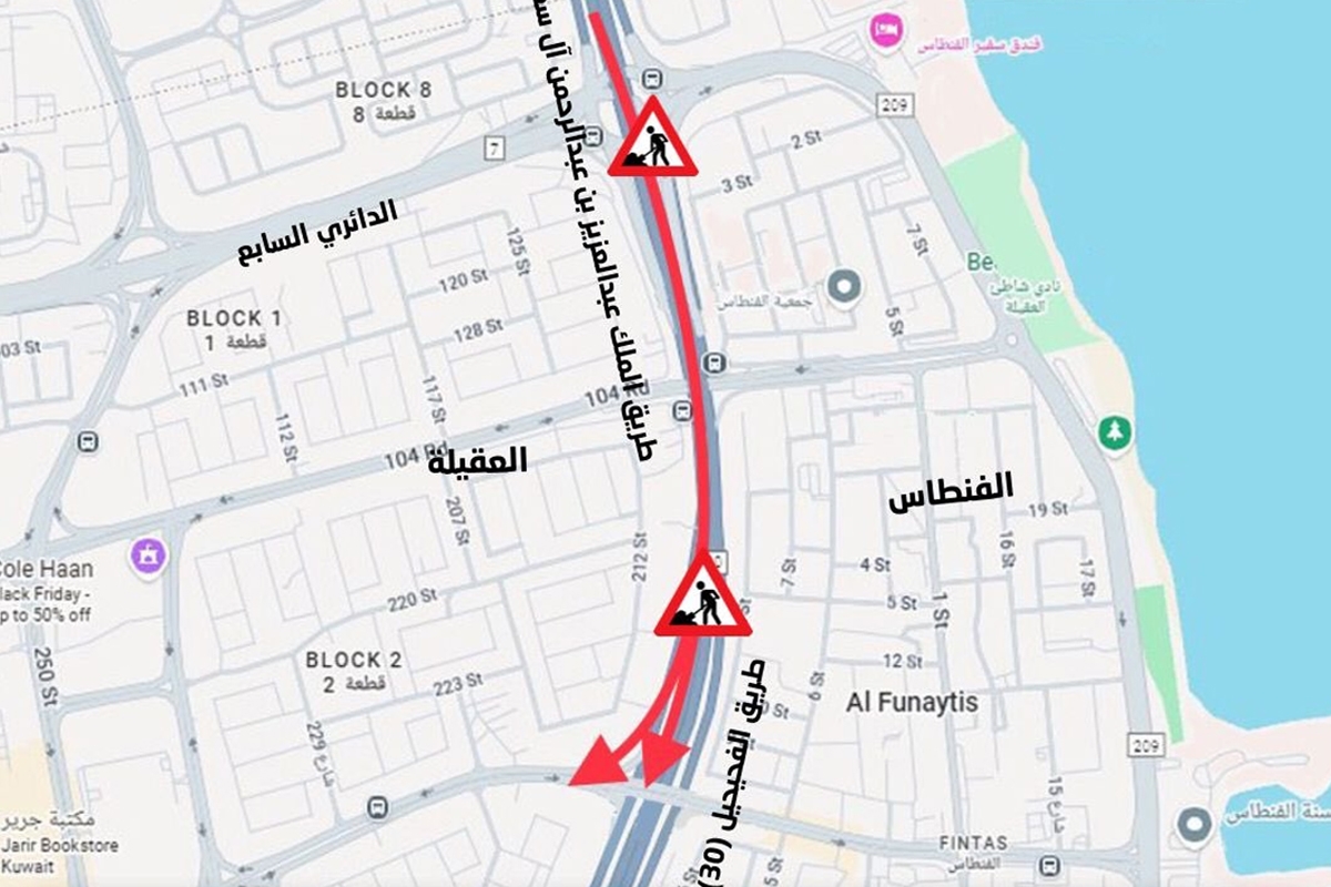 أعلنت الإدارة العامة للمرور عن إغلاق الحارة اليمنى والحارة الوسطى مع إغلاق تقاطع العقيلة والفنطاس، على طريق الملك عبدالعزيز بن عبدالرحمن آل سعود «طريق الفحيحيل» للقادم من مدينة الكويت باتجاه الفحيحيل، وذلك اعتباراً من اليوم الإثنين الموافق 2025/12/8 وحتى يوم الثلاثاء الموافق 2025/12/23.