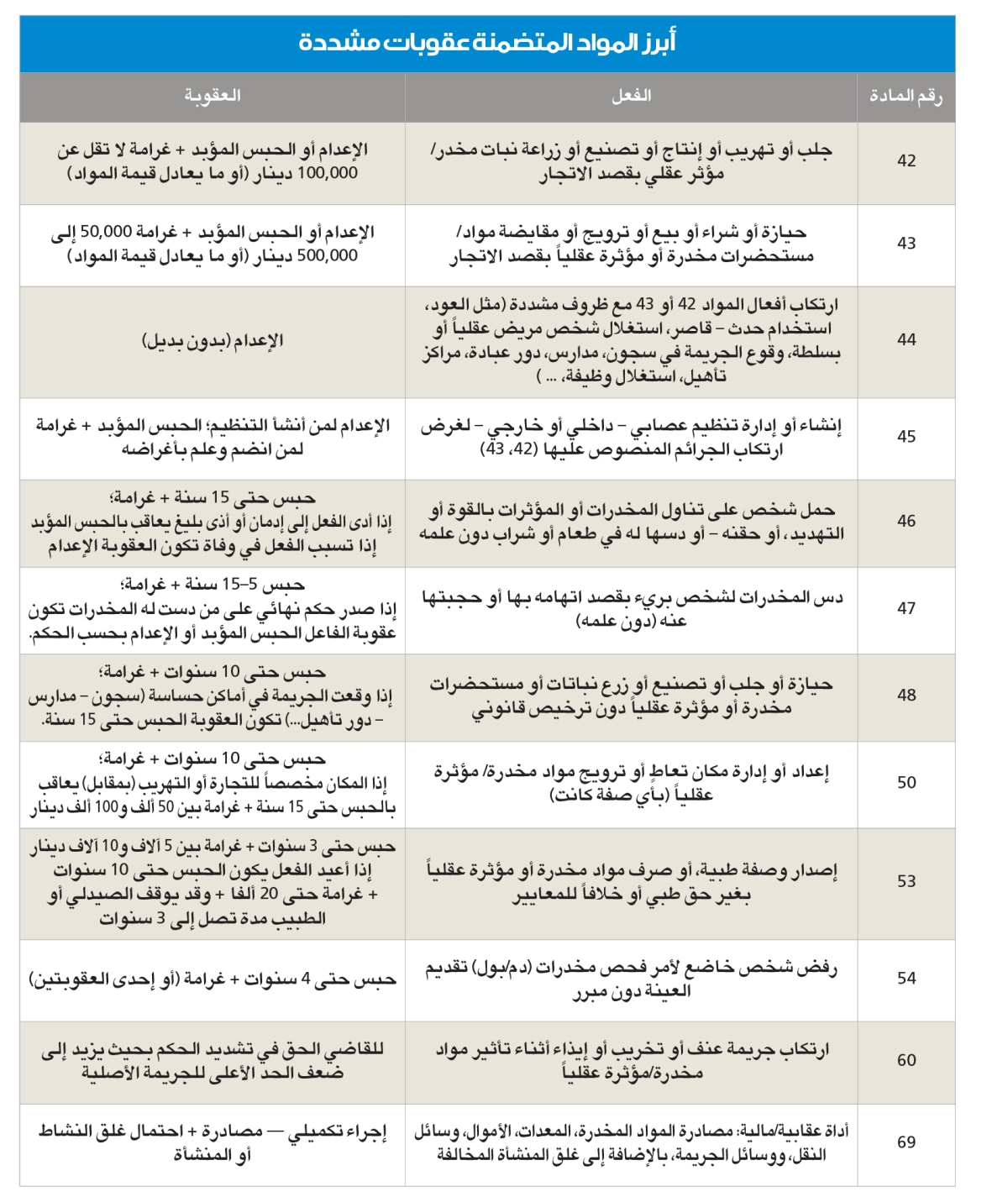 - المادة 42 من القانون الجديد تساوي بين جلب وتهريب المخدرات أو المستحضرات المؤثرة عقلياً، ومن أنتجها بقصد الاتجار، ومن زرعها، حيث تتوعد كل هذه الأصناف بعقوبة تصل إلى الإعدام، أو الحبس المؤبد مقروناً بغرامة لا تقل عن مئة ألف دينار ولا تجاوز مليوني دينار.