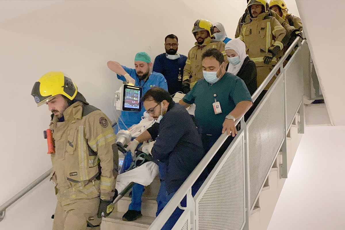 ومن خلال السيناريو تلقت القوة بلاغاً باندلاع حريق في أحد الأجنحة بمستشفى الأميري، فتم تحريك مركز إطفاء الهلالي إلى الموقع، حيث باشروا عملية إخلاء المرضى والأطقم الطبية وإنقاذ المصابين والسيطرة على الحريق الافتراضي.
