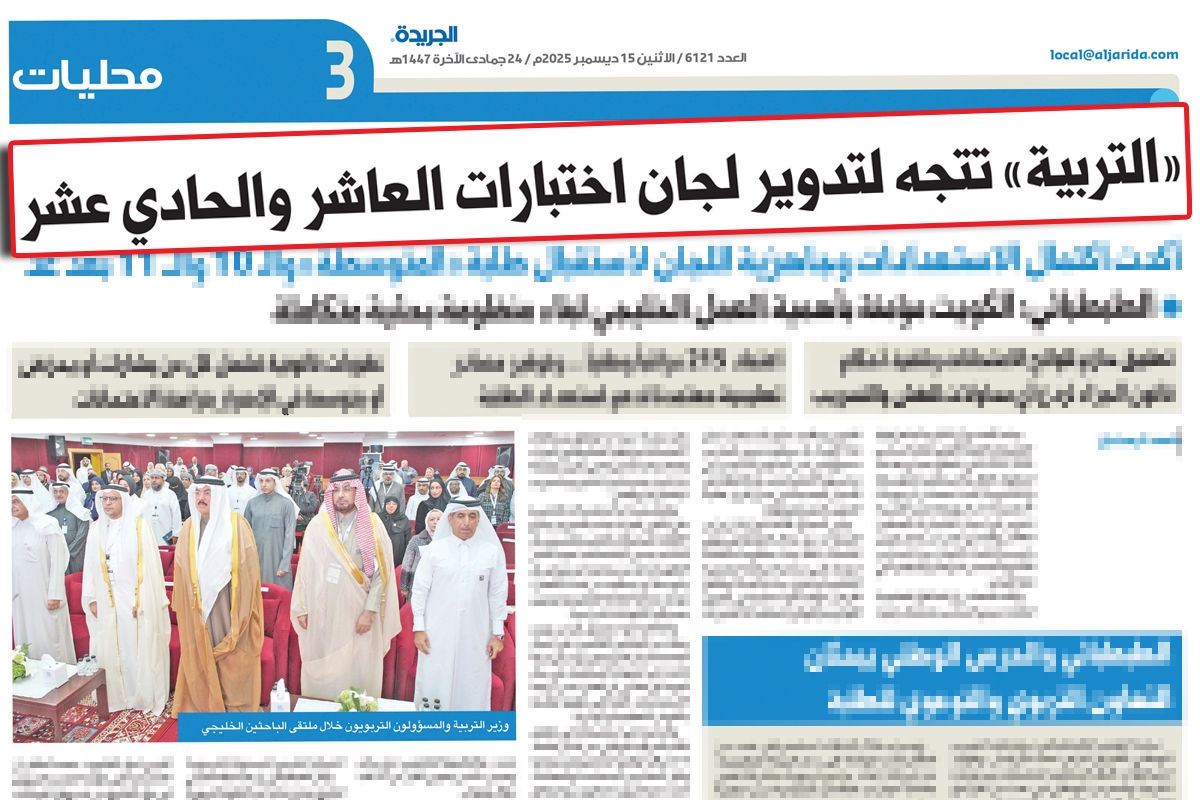 تأكيداً لخبر الجريدة المنشور في عددها اليوم، أصدر وكيل التعليم بوزارة التربية، م. حمد الحمد، تعميماً بإجراء تدوير بين رؤساء لجان اختبارات المرحلة المتوسطة والصفين العاشر والحادي عشر، على أن يكون التدوير داخل المنطقة التعليمية نفسها. وأكد الحمد إعفاء رؤساء اللجان والمكلفين بالامتحانات خارج مدارسهم من البصمة.