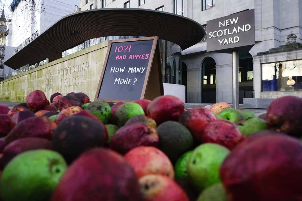 فوجئت شرطة لندن اليوم الجمعة بوضع 1071 تفاحة فاسدة من البلاستيك خارج مقرها، في عرض يسعى للإشارة إلى العدد الكبير من العاملين الذين يواجهون تحقيقات تتعلق بارتكاب جرائم جنسية أو عنف أسري.