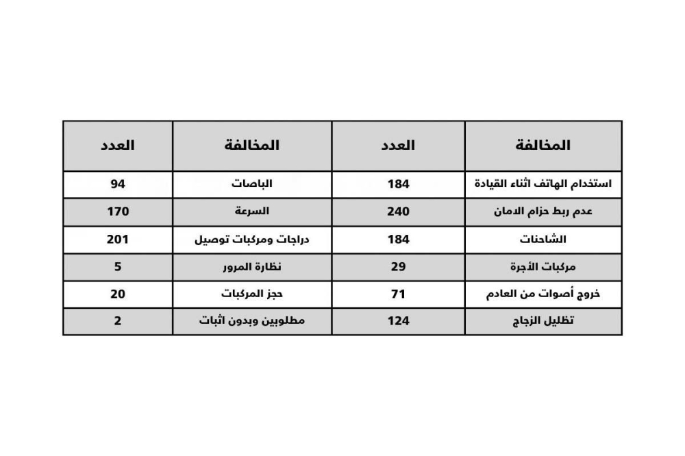 وأهابت الإدارة بجميع قائدي المركبات بضرورة الالتزام بالقوانين والشروط والضوابط المنظمة والاتصال المباشر في حالة وجود أية سلوكيات خاطئة أو رصد أية أعمال استهتار ورعونة على هاتف الطوارئ «112» أو على رقم «واتس آب» الإدارة العامة للمرور «99324092» حفاظاً على سلامة الجميع.